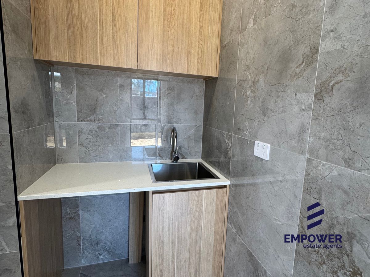 Both bedrooms are well-proportioned and feature built-in mirrored wardrobes, providing ample storage space. The bathroom is elegantly appointed with floor-to-ceiling grey tiles, a spacious walk-in shower with a rainfall shower head, and a contemporary vanity. An internal laundry area adds to the convenience, complete with a sink and cabinetry for extra storage.
