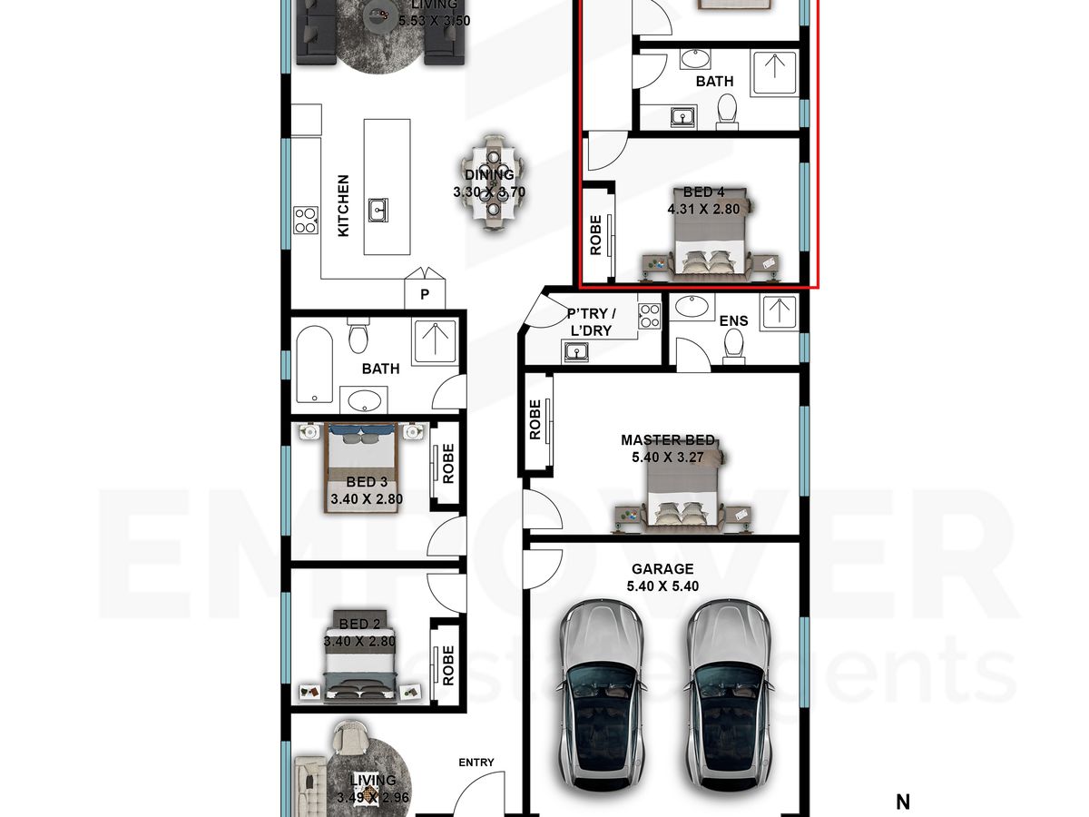 From the moment you step inside, a long, refined central hallway sets the tone — drawing you through to a formal living room and a breathtaking open-plan living, dining, and kitchen domain that forms the true heart of the home. The designer kitchen is complemented by a fully equipped Butler's Kitchen, perfect for those who love to entertain without compromising on presentation. Wide sliding doors open out to a covered alfresco deck, creating a seamless indoor-outdoor flow ideal for year-round entertaining and relaxed family gatherings.